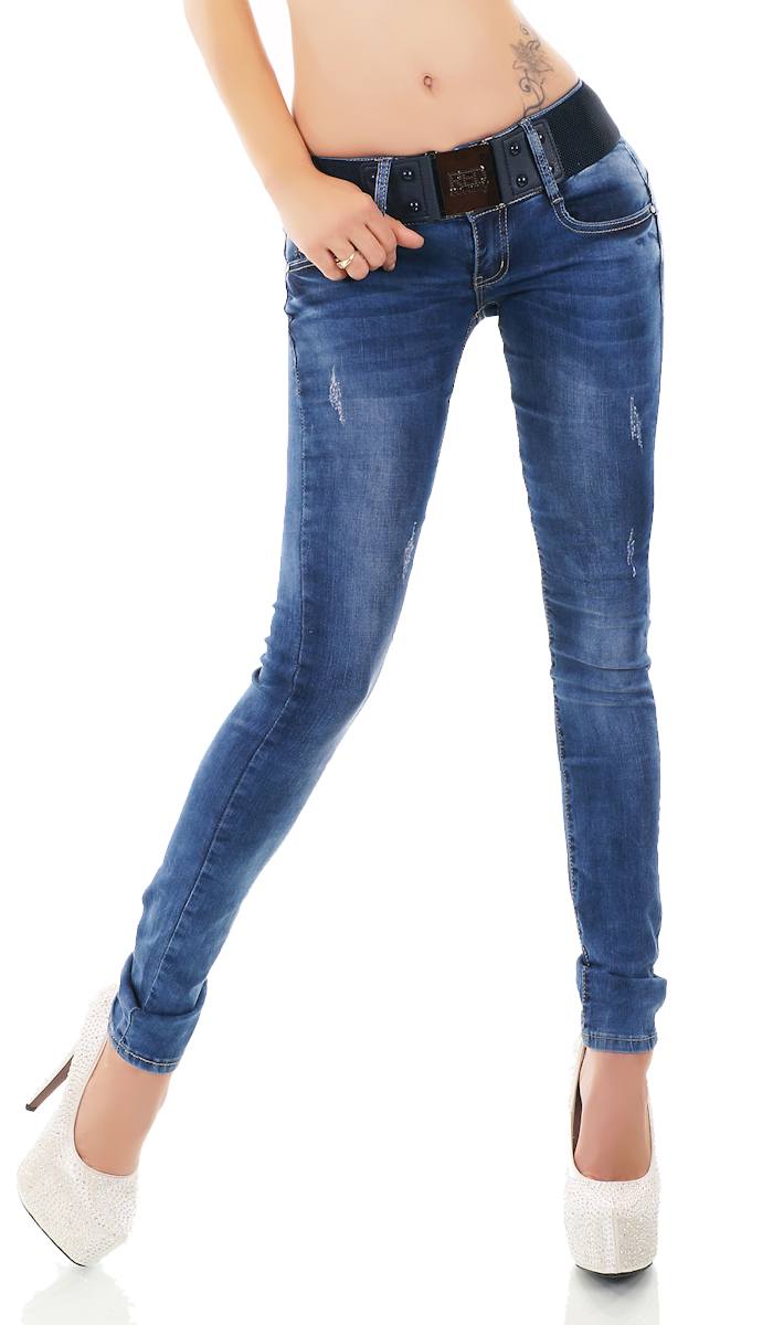 Modische Röhren-Jeans aus dünnem Stretch-Denim mit leichten Vintage-Effekten und Nieten an den Taschenkanten. Breiter Bund mit mehrreihiger Knopfleiste und verdecktem Reißverschluss Dazu wird ein breiter Stretch-Gürtel geliefert.